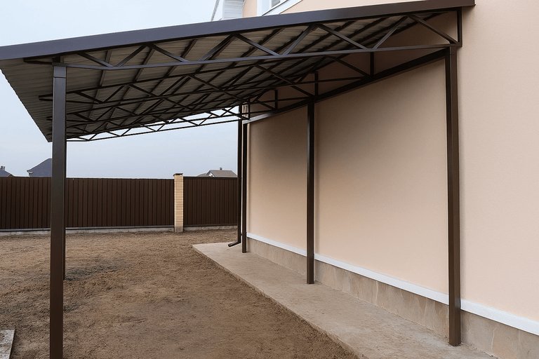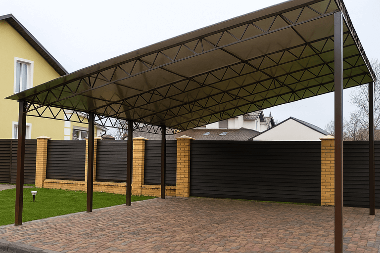 Навес для автомобиля из металлопрофиля защищает транспорт от осадков, солнца и пыли. Конструкция устойчива к ветровым и снеговым нагрузкам и подходит для круглогодичного использования.
